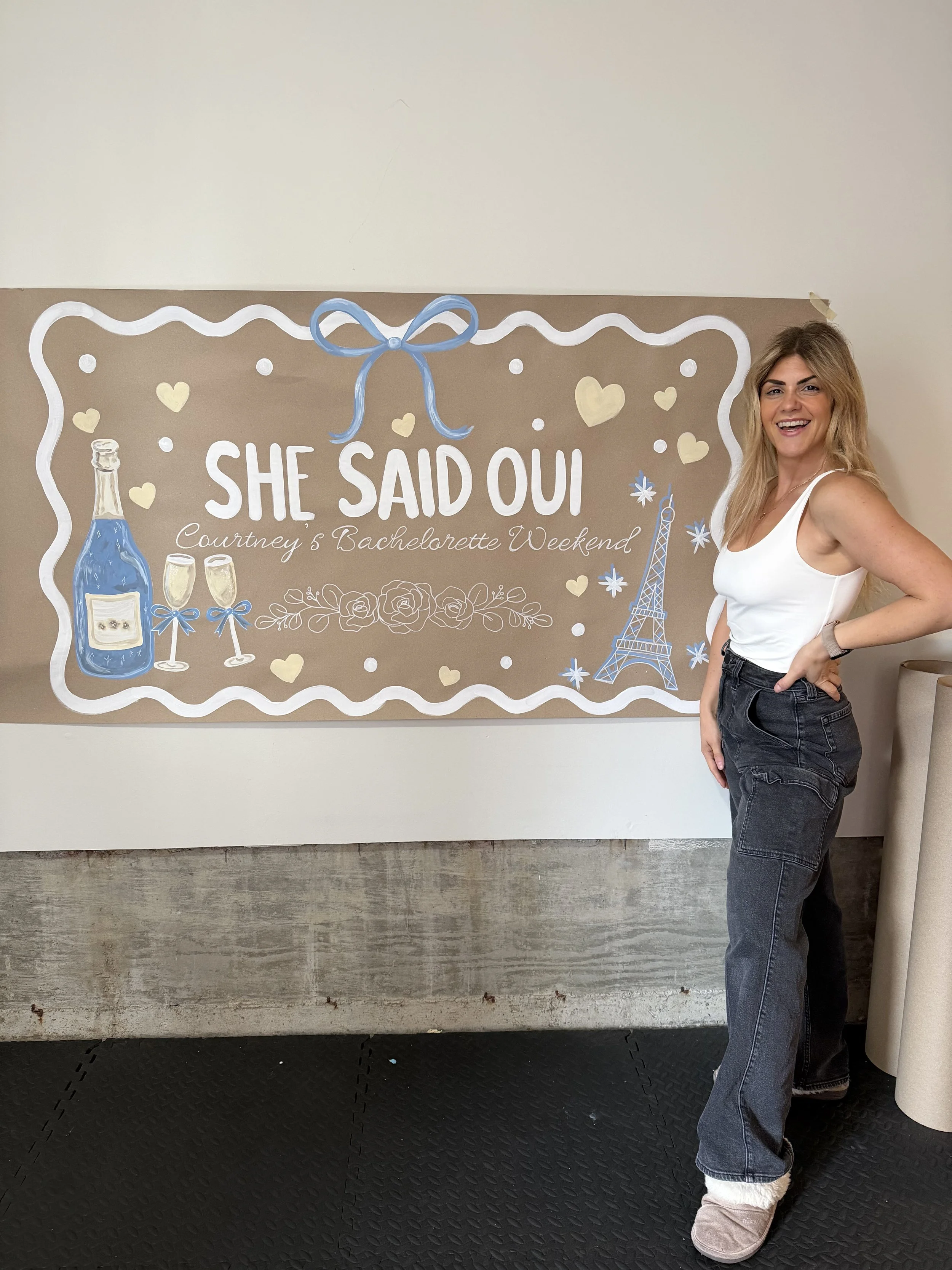 Each banner takes hours to create across multiple nights and nap times — I start by digital designing, then cross-checking mockups for approval with client so that we get it just right, painting across 1-2 days, and always prioritizing important details.